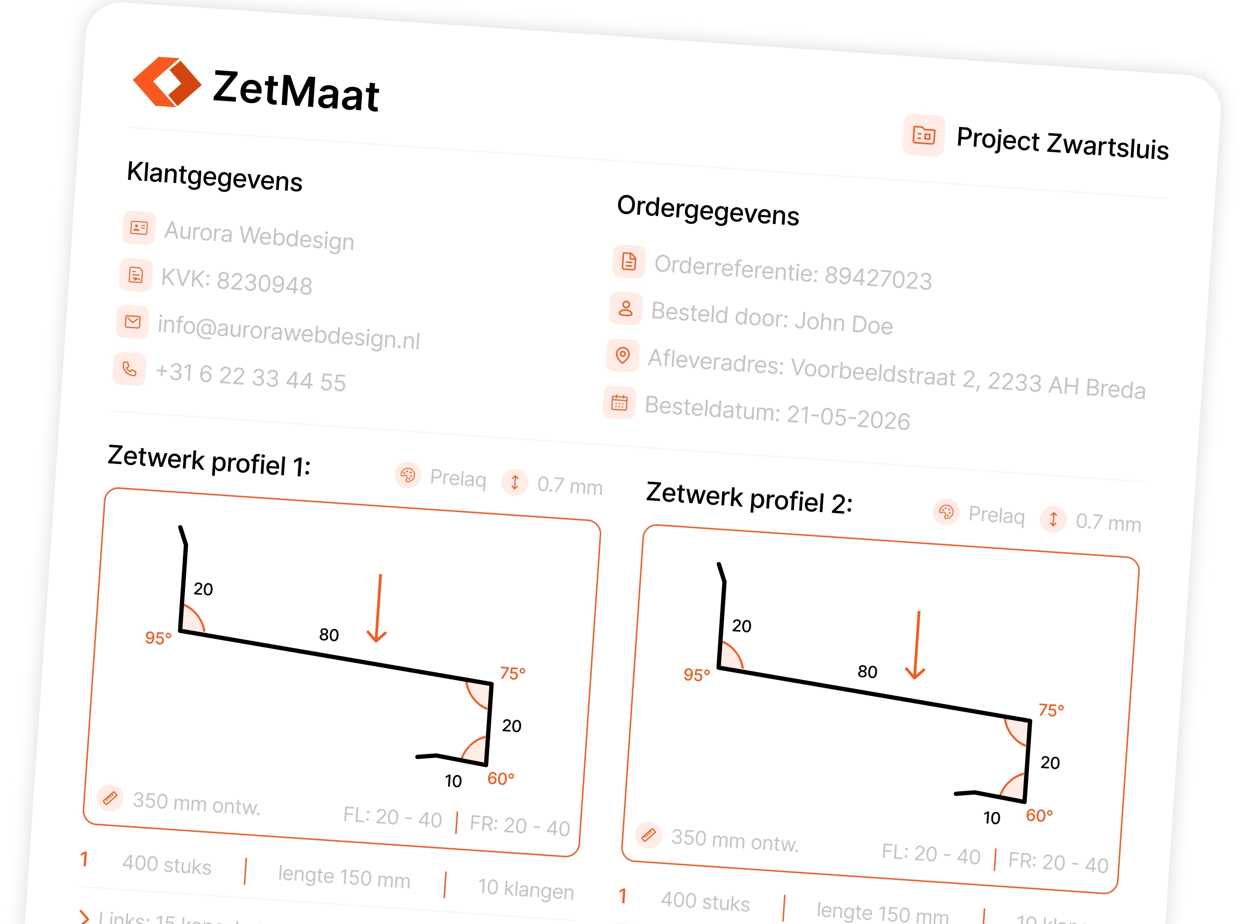 Met ZetMaat zet u uw orders, inclusief alle zetwerkprofielen, in één klik om naar een overzichtelijke PDF die u direct kunt delen met uw leverancier of collega.